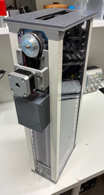 The version I built contains 50 baskets with a total capacity of up to 700 SMD components. An Arduino Uno with a stepper motor drives the elevator, while a Python script on a PC/Raspberry Pi manages the database and user interface.